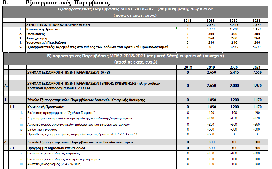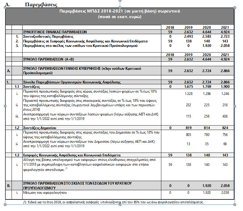 Τα ποσά προκύπτουν από το νέο Μεσοπρόθεσμο Προϋπολογισμό 2018 - 2021 που περιλαμβάνεται ως παράρτημα στον Εφαρμοστικό νόμο "γίγα" των εκατοντάδων σελίδων με τις ρυθμίσεις και τα συνοδευτικά κείμενα.