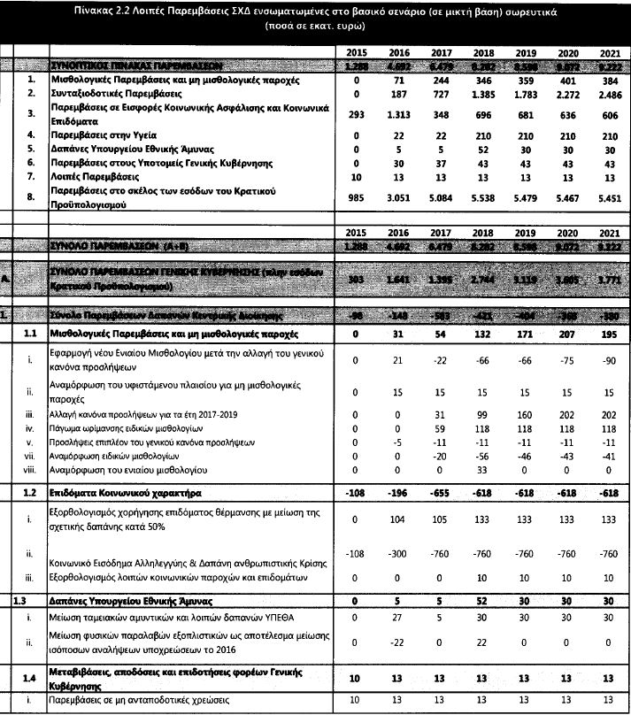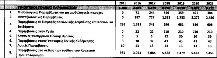 όταν η κυβέρνηση μιλούσε για παρεμβάσεις αξίας 3,6 δισ. ευρώ ή 2% του ΑΕΠ. Οι συνταξιοδοτικές παρεμβάσεις θα ξεκινήσουν σε αξία από τα 2,49 δισ. ευρώ το 2019, για να κλιμακωθούν στα 2,58 δισ. ευρώ το 2020 και στα 2,72 δισ. ευρώ το 2021. Οι παρεμβάσεις στο σκέλος του αφορολόγητου ορίου ξεκινούν το 2020 από τα 1,92 δισ. ευρώ για να φτάσουν στα 2,058 δισ. ευρώ το 2021.