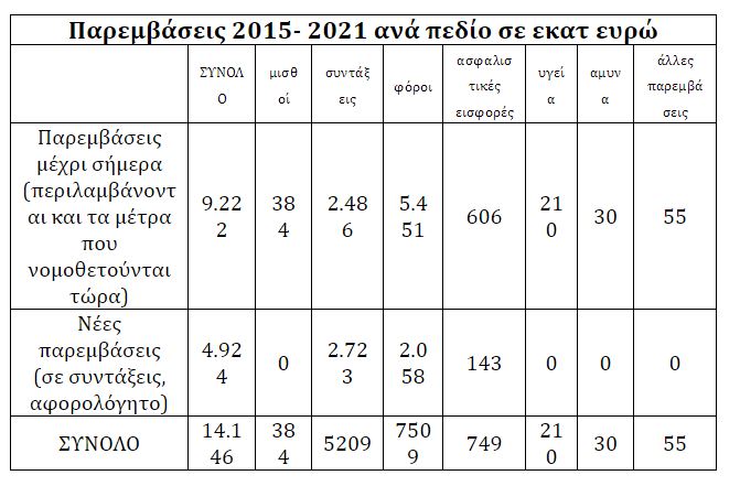 Η αξία των περικοπών σε αφορολόγητο και συντάξεις φτάνει στα 4,924 δισ. ευρώ το 2021 και στα 4,6 δισ. ευρώ το 2020, όταν η κυβέρνηση μιλούσε για παρεμβάσεις αξίας 3,6 δισ. ευρώ ή 2% του ΑΕΠ. Οι συνταξιοδοτικές παρεμβάσεις θα ξεκινήσουν σε αξία από τα 2,49 δισ. ευρώ το 2019, για να κλιμακωθούν στα 2,58 δισ. ευρώ το 2020 και στα 2,72 δισ. ευρώ το 2021. Οι παρεμβάσεις στο σκέλος του αφορολόγητου ορίου ξεκινούν το 2020 από τα 1,92 δισ. ευρώ για να φτάσουν στα 2,058 δισ. ευρώ το 2021.