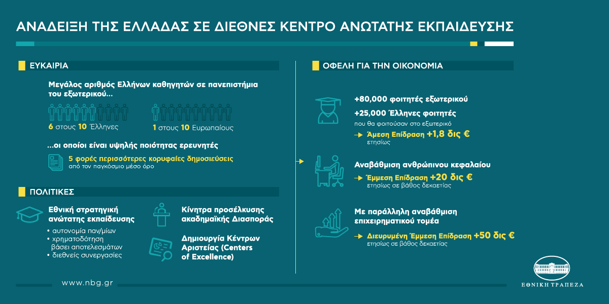 Οι αναλυτές της Διεύθυνσης Οικονομικής Ανάλυσης της Εθνικής Τράπεζας εκτιμούν ότι η ανάδειξη της Ελλάδας σε διεθνές κέντρο ανώτατης εκπαίδευσης θα έχει πολλαπλά οφέλη για την ελληνική οικονομία.