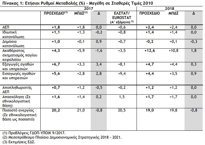 Επισημαίνει ότι "οι αρνητικές επιπτώσεις λόγω της μείωσης της δημόσιας κατανάλωσης και ιδίως των δημοσίων επενδύσεων το 2018 είναι δυνατό, υπό προϋποθέσεις, να μη σταθούν εμπόδιο στις αναπτυξιακές προοπτικές που ανοίγει η ολοκλήρωση του προγράμματος εντός του 2018 και η αποκατάσταση της ομαλής χρηματοδότησης της χώρας από τις διεθνείς χρηματαγορές. Η ροή επενδύσεων και ο εξαγωγικός προσανατολισμός της οικονομίας θα αποτελέσουν κλειδιά για την επίτευξη του μεσοπρόθεσμου στόχου μεγέθυνσης της οικονομίας για το 2018".