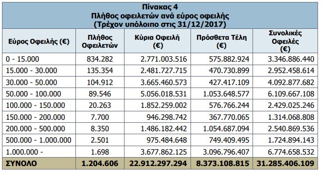 - Το 97,3% (30.434.870.671 ευρώ) έχει δημιουργηθεί από παλαιούς οφειλέτες, με οφειλές μέχρι και τα τέλη του 2014, και το υπόλοιπο 2,7% (ποσό 850.535.437) δημιουργήθηκε από νέους οφειλέτες, από τις αρχές του 2015 και μετά.