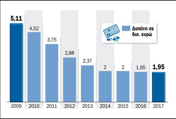 Πιο συγκεκριμένα, το 2010 το ύψος της φαρμακευτικής δαπάνης ανήλθε σε 4,52 δισ. ευρώ. Το 2011 το όριο διαμορφώθηκε σε 3,75 δισ., το 2012 σε 2,88 δισ., το 2,13 σε 2,37 δισ. ευρώ, τη διετία 2014-2015 σε 2 δισ.