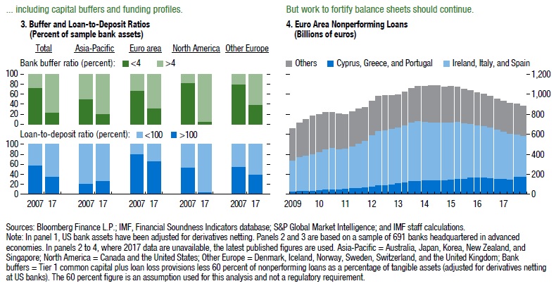 Παρότι τα buffers ("μαξιλάρια" ρευστότητας) των τραπεζών είναι ενισχυμένα συνολικά, υπάρχει μια σειρά πιο αδύναμων τραπεζών, που αντιπροσωπεύουν περίπου το 20% του δείγματος ενεργητικού και οι οποίες έχουν χαμηλότερα επίπεδα κεφαλαίων και προβλέψεων έναντι μη εξυπηρετούμενων δανείων. Αυτές οι τράπεζες, λέει το ΔΝΤ, βρίσκονται συγκεντρωμένες κυρίως στην Ευρώπη (εντός και εκτός ζώνης ευρώ) και θα ήταν πιο ευαίσθητες σε μια απότομη αναταραχή στις αγορές ή απροσδόκητη οικονομική ύφεση.