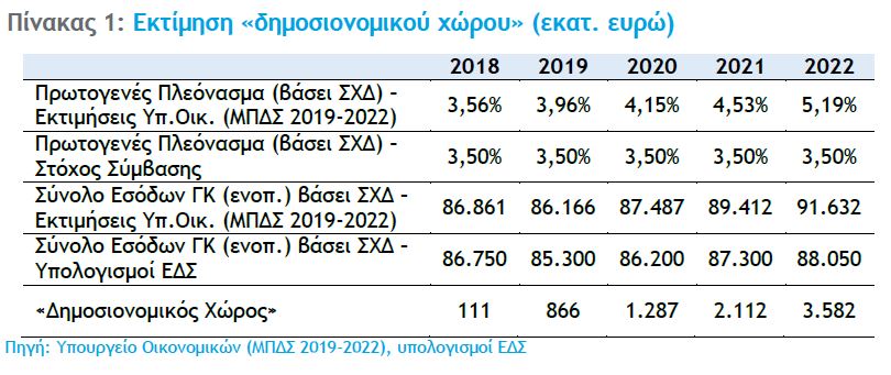 Όπως αναφέρει το Δημοσιονομικό Συμβούλιο, "ο στόχος που τίθεται στο ΜΠΔΣ 2019-2022 για πρωτογενές πλεόνασμα της τάξης του 3,5% είναι απαιτητικός. Ωστόσο οι ισχυρές δημοσιονομικές επιδόσεις που κατεγράφησαν το 2016 και το 2017 (πρωτογενές πλεόνασμα 3,9% και 4,2% του ΑΕΠ αντίστοιχα) καθιστούν θεμιτή την εκτίμηση ότι είναι επιτεύξιμη η στόχευση για πρωτογενή πλεονάσματα της τάξεως του 3,5% του ΑΕΠ. Η επίτευξη του στόχου όπως έχει τεθεί από το Υπουργείο Οικονομικών στο ΜΠΔΣ 2019-2022, σε συνδυασμό με μεγέθυνση 2,16% σε μέσο ετήσιο ρυθμό μεταξύ 2018 και 2022, προϋποθέτει τη συγκράτηση των δημοσίων δαπανών στα επίπεδα των 86-87,5 δισ. ευρώ και τη διατήρηση μιας ελαφράς αυξητικής τάσης των δημοσίων εσόδων με μέσο ετήσιο ρυθμό της τάξης του 1,35%. Πάντως για την επίτευξη του δημοσιονομικού στόχου όπως έχει τεθεί στη Σύμβαση Χρηματοδοτικής Διευκόλυνσης (ΣΧΔ) -με δεδομένο το ύψος των δαπανών- θα αρκούσε ηπιότερη αύξηση των δημοσίων εσόδων. Θα μπορούσε συνεπώς να θεωρηθεί ότι το πλεόνασμα των εσόδων που προκύπτει από αυτήν τη διαφορά ισοδυναμεί με αντίστοιχης έκτασης οιονεί "δημοσιονομικό χώρο", ο οποίος είναι δυνατό να αξιοποιηθεί σε στοχευμένες, σταδιακές και προγραμματισμένες μειώσεις της φορολογικής επιβάρυνσης".