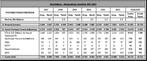 Συγκεκριμένα, προβλέπονται 42.521 προσλήψεις στην Κεντρική Διοίκηση, τους ΟΤΑ, τους ασφαλιστικούς οργανισμούς, στα νομικά πρόσωπα και τις ΔΕΚΟ. Την ίδια περίοδο, προβλέπονται 44.174 αποχωρήσεις. Έτσι, προβλέπεται καθαρή μείωση του προσωπικού.