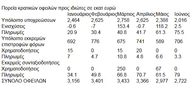 Μέσα στον Ιούνιο μειώθηκαν οι ληξιπρόθεσμες υποχρεώσεις του κράτους προς τους ιδιώτες κατά 372 εκατ. ευρώ, τη στιγμή που στις "τσέπες" ιδιωτών που περίμεναν επί μήνες ή και χρόνια τα λεφτά τους έφτασαν μόνο 75,5 εκατ. ευρώ, σύμφωνα με τα στοιχεία που δημοσιοποίησε χθες το υπουργείο Οικονομικών. Σύμφωνα με κυβερνητικές πηγές, μία από τις εξηγήσεις που δίνονται για τα στοιχεία αυτά είναι οι συμψηφισμοί που έγιναν.
