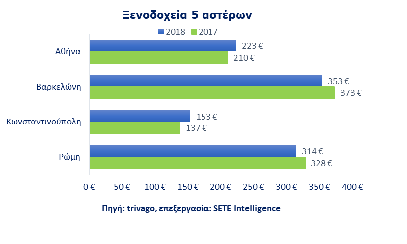 Την υψηλότερη τιμή κράτησης στα ξενοδοχεία 5 αστέρων κατέχει η Βαρκελώνη με 353 ευρώ, ενώ στη Ρώμη η τιμή ανέρχεται στα 314. Στην Αθήνα η τιμή ανέρχεται στα 223 ευρώ έναντι 210 το 2017 και στην Κωνσταντινούπολη μόλις στα 153 ευρώ. Στην κατηγορία 4 αστέρων η τιμή κράτησης για την Αθήνα ήταν 126 ευρώ έναντι 117 ευρώ το 2017.