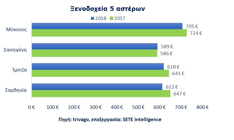 Το μήνα που πέρασε, η Μύκονος είχε υψηλότερη τιμή σε όλες τις κατηγορίες, με εξαίρεση τα ξενοδοχεία τεσσάρων αστέρων (2η υψηλότερη), ενώ η Σαντορίνη εμφανίζει την υψηλότερη τιμή στα τετράστερα ξενοδοχεία (παρουσιάζοντας όμως μείωση σε σχέση με το 2017). Στην κατηγορία 4 αστέρων η τιμή κράτησης για Σαντορίνη ανήλθε στα 392 ευρώ από τα 403 τον Ιούλιο του 2017, στην Μύκονο στα 357 ευρώ (αμετάβλητη) και στην Ίμπιζα στα 305 ευρώ έναντι 323 ευρώ το 2017.