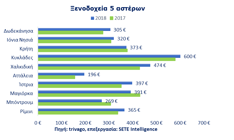 Παρόμοια είναι η εικόνα και για την πλειονότητα των δημοφιλών ελληνικών προορισμών. Την υψηλότερη τιμή κράτησης στα ξενοδοχεία 5 αστέρων στην Ελλάδα κατέχουν οι Κυκλάδες με 600 ευρώ και ακολουθεί η Χαλκιδική με 474 ευρώ και η Κρήτη με 373 ευρώ. Από τους ανταγωνιστικούς προορισμούς, οι τιμές στη Μαγιόρκα ανήλθαν στα 391 ευρώ. Στην Τουρκία σημειώθηκαν οι πιο χαμηλές τιμές, στην Αλικαρνασσό 269 ευρώ και στην Αττάλεια 196 ευρώ. Στα ξενοδοχεία 4 αστέρων, την υψηλότερη τιμή κράτησης στα ξενοδοχεία 4 αστέρων κατέχουν οι Κυκλάδες.