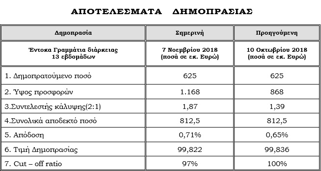 Η δημοπρασία πραγματοποιήθηκε μέσω των Βασικών Διαπραγματευτών Αγοράς (Primary Dealers), και η ημερομηνία διακανονισμού είναι η Παρασκευή 9 Νοεμβρίου 2018.