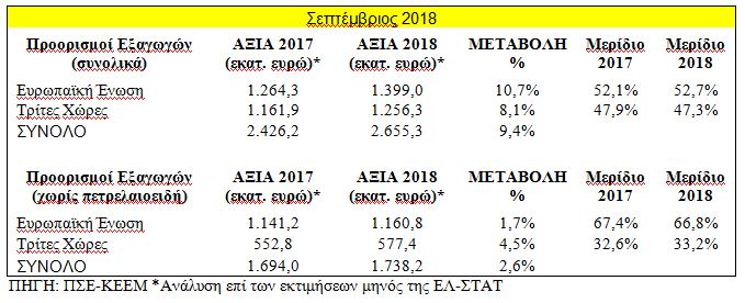 Ειδικότερα, σύμφωνα με ανάλυση του Πανελληνίου Συνδέσμου Εξαγωγέων και του Κέντρου Εξαγωγικών Ερευνών και Μελετών (ΚΕΕΜ), επί των προσωρινών στοιχείων της ΕΛ-ΣΤΑΤ, οι εξαγωγές, συμπεριλαμβανομένων των πετρελαιοειδών, τον Σεπτέμβριο του 2018 αυξήθηκαν κατά 229 εκατ. ευρώ ή κατά 9,4% και ανήλθαν στα 2,65 δισ. ευρώ από 2,42 δισ. ευρώ το αντίστοιχο διάστημα του 2017. Ανοδικά κινήθηκαν οι εξαγωγές και χωρίς πετρελαιοειδή. Συγκεκριμένα, ενισχύθηκαν κατά 2,6% ή κατά 44,2 εκατ. ευρώ και έφθασαν στα 1,74 δισ. ευρώ από 1,69 δισ. ευρώ.