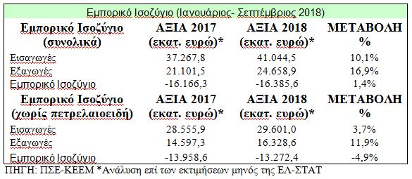 Στο εννεάμηνο του 2018 το εμπορικό έλλειμμα αυξήθηκε κατά 219 εκατ. ευρώ ή κατά 1,4%, στα –16,39 δισ. ευρώ από –16,17 δισ. ευρώ το αντίστοιχο διάστημα του 2017. Το ενθαρρυντικό είναι ότι χωρίς τα πετρελαιοειδή, το εμπορικό έλλειμμα μειώθηκε στα -13,27 δισ. ευρώ από -13,96 δισ. ευρώ, δηλαδή κατά 686,2 εκατ. ευρώ, ή κατά –4,9%.