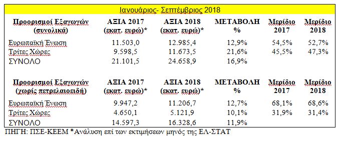 Παρόμοια είναι η εικόνα και στο διάστημα Ιανουαρίου – Σεπτεμβρίου 2018. Οι εξαγωγές αυξήθηκαν κατά 3,56 δισ. ευρώ ή κατά 16,9% και ανήλθαν σε 24,65 δισ. ευρώ από 21,1 δισ. ευρώ ενώ χωρίς τα πετρελαιοειδή αυξήθηκαν στα 16,33 δισ. ευρώ από 14,6 δισ. ευρώ, δηλαδή κατά 1,73 δισ. ευρώ ή κατά 11,9%.