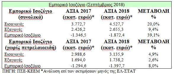 Ανοδικά κινήθηκαν όμως και οι εισαγωγές τον Σεπτέμβριο του 2018, οι οποίες αυξήθηκαν κατά 755 εκατ. ευρώ ή κατά 20% και ανήλθαν σε 4,52 δισ. ευρώ έναντι 3,77 δισ. ευρώ κατά τον ίδιο μήνα του έτους 2017. Εξαιρουμένων των πετρελαιοειδών, οι εισαγωγές αγαθών ανήλθαν στα 3,14 δισ. ευρώ από 2,99 δισ. ευρώ, δηλαδή αυξήθηκαν κατά 147,3 εκατ. ευρώ ή κατά 4,9%.