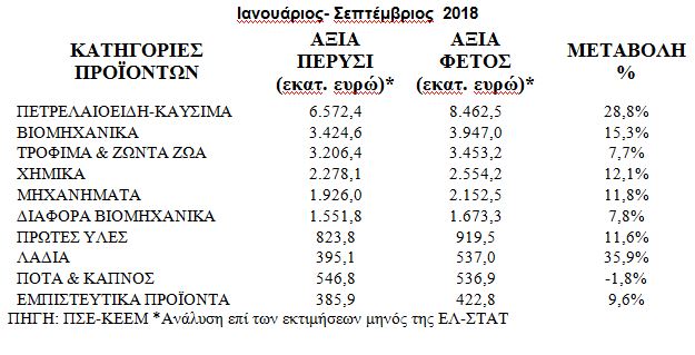 Κατά το διάστημα Ιανουαρίου – Σεπτεμβρίου του 2018 όλες οι κατηγορίες ήταν ανοδικές, πλην των ποτών και καπνού (-1,8%). Στο διάστημα αυτό ξεχώρισαν τα λάδια (+35,9%), τα πετρελαιοειδή (+28,8%), και τα βιομηχανικά προϊόντα (+15,3%).