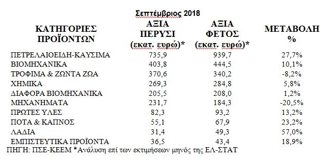 Σχετικά με τις μεγάλες κατηγορίες προϊόντων, τον Σεπτέμβριο του 2018 όλοι οι κλάδοι ήταν ανοδικοί πλην των μηχανημάτων (-20,5%) και των τροφίμων και ζώντων ζώων (-8,2%). Τη μεγαλύτερη αύξηση παρουσίασαν οι κλάδοι των λαδιών (+57%) των πετρελαιοειδών (+27,7%), των ποτών και καπνού (+23,2%) και των πρώτων υλών (+13,2%).