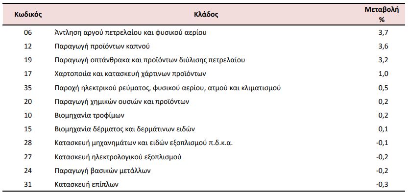 Στην αύξηση του Γενικού Δείκτη Τιμών Εισαγωγών (σύνολο αγοράς) κατά 1,1%, συνέβαλαν κυρίως οι μεταβολές των δεικτών των διψήφιων κλάδων (divisions) της ταξινόμησης NACE Αναθ. 2, ως εξής: