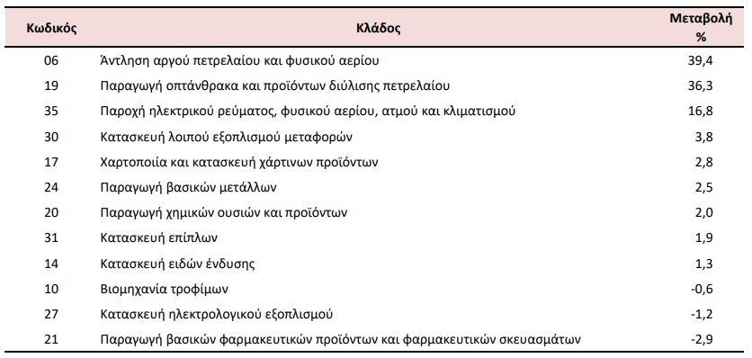 Στην αύξηση του Γενικού Δείκτη Τιμών Εισαγωγών (σύνολο αγοράς) κατά 9,6% συνέβαλαν κυρίως οι μεταβολές των δεικτών των διψήφιων κλάδων (divisions) της ταξινόμησης NACE Αναθ. 2, ως εξής: