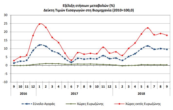 Αύξηση 9,6% παρουσίασε ο Γενικός Δείκτης Τιμών Εισαγωγών στη Βιομηχανία, με έτος βάσης 2010=100,0 και μήνα αναφοράς τον Σεπτέμβριο 2018, σε σύγκριση με τον αντίστοιχο δείκτη Σεπτεμβρίου 2017, έναντι αύξησης 4,1% που σημειώθηκε κατά την σύγκριση των αντίστοιχων δεικτών του έτους 2017 με το 2016.