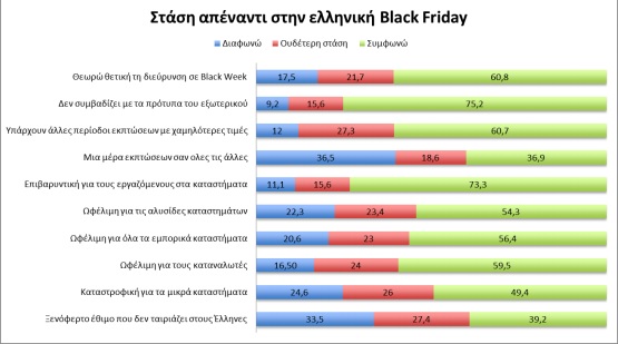 "Μια μέρα εκπτώσεων σαν όλες τις άλλες" χαρακτηρίζει τη Black Friday το 37% των καταναλωτών ενώ το 61% πιστεύει πως υπάρχουν άλλες περίοδοι εκπτώσεων με χαμηλότερες τιμές. Το 75,2% εκφράζει τη δυσαρέσκειά του για το ότι η Black Friday στην Ελλάδα δεν ακολουθεί τα πρότυπα του εξωτερικού.