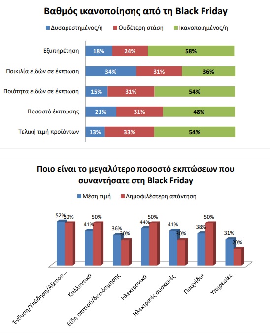 Ικανοποιημένοι από τις τελικές αγορές του δηλώνει το 86% των καταναλωτών, αλλά όχι και τόσο από τις επιμέρους διαστάσεις της εμπειρίας τους. Ένας στους δύο (50%) δήλωσε ικανοποιημένος από την τελική τιμή των προϊόντων, 37% από το ποσοστό έκπτωσης, 47% από την ποιότητα, 30% από την ποικιλία των ειδών που είχαν έκπτωση και 55% από την εξυπηρέτηση. Μόνον το 45% σκοπεύει να πραγματοποιήσει αγορές και στην Black Friday 2019, ενώ ακόμα λιγότεροι ( 34%) θα προτείνουν τη Black Friday και σε φίλους τους.