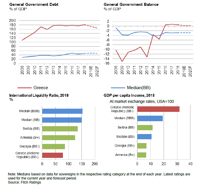 H Fitch επισημαίνει πως η αξιολόγηση "ΒΒ-" της Ελλάδας στηρίζεται σε υψηλά επίπεδα κατά κεφαλήν εισοδήματος, τα οποία υπερβαίνουν κατά πολύ εκείνα των χωρών με αξιολόγηση στην κατηγορία "ΒΒ" και "ΒΒΒ". Η διακυβέρνηση είναι επίσης σημαντικά ισχυρότερη από ό,τι στις περισσότερες χώρες με παρόμοιο rating. Το προφίλ του χρέους γενικής κυβέρνησης είναι εξαιρετικά ευνοϊκό και οι πρόσφατες δημοσιονομικές επιδόσεις είναι ισχυρότερες σε σχέση με αυτές των άλλων χωρών ίδιας αξιολόγησης. Παρά τους θετικούς αυτούς παράγοντες η ελληνική οικονομία είναι αντιμέτωπη με τέσσερις σημαντικές προκλήσεις, όπως προειδοποιεί η Fitch. Τα υψηλά αποθέματα χρέους της γενικής κυβέρνησης και καθαρού εξωτερικού χρέους, το ασθενές μεσοπρόθεσμο αναπτυξιακό δυναμικό και το εξαιρετικά υψηλό επίπεδο μη εξυπηρετούμενων δανείων στον τραπεζικό τομέα, βαραίνουν τις προοπτικές της χώρας.