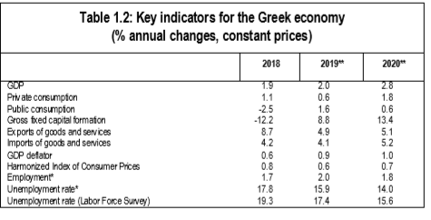 Η οικονομική ανάπτυξη αναμένεται να επιταχυνθεί με τη στροφή προς πολιτικές φιλικές προς την ανάπτυξη και με διαρθρωτικές μεταρρυθμίσεις που βελτιώνουν το επενδυτικό περιβάλλον, αναφέρει το ΥΠΟΙΚ αιτιολογώντας την εκτίμηση για άνοδο του ΑΕΠ κατά 2,8% το 2020. Ως κύριο παράγοντα αναφέρει τις παρεμβάσεις 1,18 δισ. ευρώ "και μέσω αυτών την εδραίωση του περιβάλλοντος των θετικών προσδοκιών που ήδη αναπτύσσονται στην οικονομία". Εκτιμά ότι θα τονώσουν το ΑΕΠ κατά 0,5% (1 δις ευρώ) με κύριο μοχλό την αναδιάρθρωση του φόρου εισοδήματος φυσικών προσώπων και τη μείωση φόρου στις επιχειρήσεις.