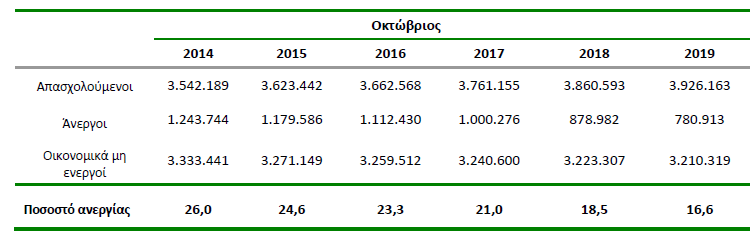 Το σύνολο των απασχολουμένων, κατά τον Οκτώβριο του 2019, εκτιμάται ότι ανήλθε σε 3.926.163 άτομα. Οι άνεργοι ανήλθαν σε 780.913 άτομα ενώ ο οικονομικά μη ενεργός πληθυσμός ανήλθε σε 3.210.319 άτομα, όπως ανακοίνωσε η ΕΛΣΤΑΤ.