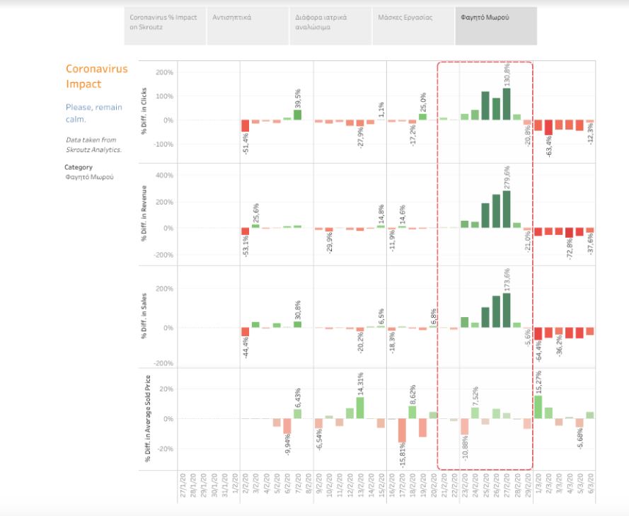 Σε ό,τι αφορά τη ζήτηση και κατ’ επέκταση την κατανάλωση αυτή έχει αυξηθεί σημαντικά με βάση τα στοιχεία και την ανάλυση από το Skroutz.gr (βλπ. σχετικά γραφήματα). Χαρακτηριστικά στις 24 Φεβρουαρίου, οπότε και έχουν γίνει γνωστά τα πρώτα κρούσματα στην Ιταλία, τα clicks στην Skroutz.gr για τέσσερις κατηγορίες προϊόντων και συγκεκριμένα για τα αντισηπτικά, τα ιατρικά αναλώσιμα, τις μάσκες εργασίας και τις παιδικές τροφές αυξήθηκαν 109,9%. Τα έσοδα σε αυτές τις κατηγορίες κινήθηκαν ανοδικά από τις 26 έως τις 29 Φεβρουαρίου με τη μεγαλύτερη άνοδο να καταγράφεται στις 27 Φεβρουαρίου. Αναφορικά με τα έσοδα στις 26 Φεβρουαρίου, αυξήθηκαν κατά 169% ενώ η μέση τιμή πώλησης για τις συγκεκριμένες κατηγορίες εμφανίζει ισχυρές αυξητικές τάσεις, αγγίζοντας το +355,9% στις 3 Μαρτίου.