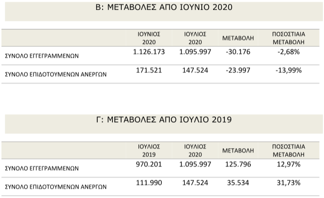 3. Το σύνολο των επιδοτούμενων ανέργων, για τον μήνα Ιούλιο 2020, (αφορά τον αριθμό των δικαιούχων που πληρώθηκαν εντός του αντίστοιχου μήνα) ανέρχεται σε 147.524 άτομα, από τα οποία οι 124.220 (ποσοστό 84,20%) είναι κοινοί και λοιπές κατηγορίες επιδοτουμένων και οι 23.304 (ποσοστό 15,80%) είναι εποχικοί τουριστικών επαγγελμάτων. Οι άνδρες ανέρχονται σε 66.354 (ποσοστό 44,98%) και οι γυναίκες σε 81.170 (ποσοστό 55,02%).