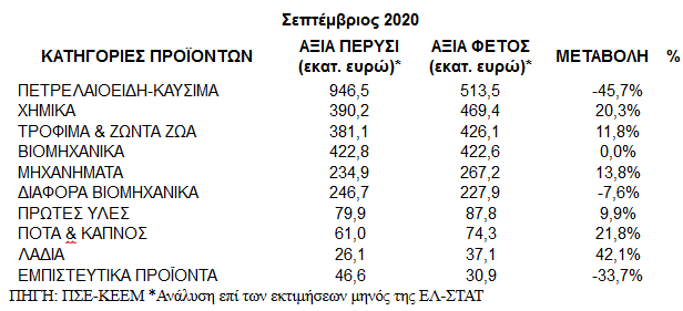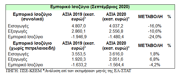 Ως αποτέλεσμα των παραπάνω κινήσεων, το εμπορικό έλλειμμα μειώθηκε σε μεγάλο βαθμό τον Σεπτέμβριο του 2020 κατά 466,5 εκατ. ευρώ, ή κατά -24%, στα -1,48 δισ. ευρώ από -1,95 δισ. ευρώ τον αντίστοιχο μήνα του 2019. Χωρίς τα πετρελαιοειδή, το εμπορικό έλλειμμα επίσης μειώθηκε, στα -1,56 δισ. ευρώ από -1,63 δισ. ευρώ, δηλαδή κατά 68,8 εκατ. ευρώ ή κατά -4,2%.