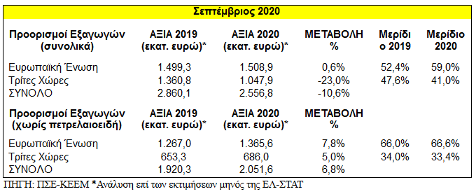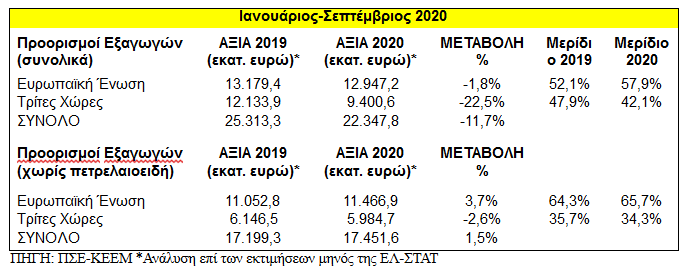Η μείωση των εξαγωγών (συμπεριλαμβανομένων των πετρελαιοειδών) και κατά τον Σεπτέμβριο, ως συνέχεια της πτωτικής πορείας των προηγούμενων μηνών, οδηγεί σε σημαντική μείωση τις εξαγωγές της χώρας για τους πρώτους εννέα μήνες του 2020. Συγκεκριμένα, οι εξαγωγές συνολικά στο διάστημα Ιανουαρίου-Σεπτεμβρίου μειώνονται κατά 2,97 δισ. ευρώ ή κατά -11,7% και ανήλθαν σε 22,35 δισ. ευρώ από 25,31 δισ. ευρώ.