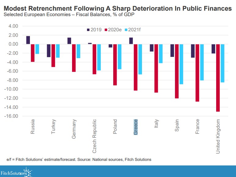 Πιο αναλυτικά, όπως σημείωσαν στελέχη της Fitch Solutions σε webinar για τις προοπτικές της παγκόσμιας οικονομίας στο οποίο συμμετείχε το Capital.gr, η Ελλάδα θα σημειώσει ύφεση της τάξης του 9% το 2020, στα ίδια επίπεδα με αυτά που είχε προβλέψει ο οίκος το περασμένο φθινόπωρο. Η ανάκαμψη του ελληνικού ΑΕΠ το 2021 τοποθετείται στο 5% από 5,6% πριν και θα είναι υψηλότερη από τον μέσο όρο της ευρωζώνης αλλά και της Γερμανίας.