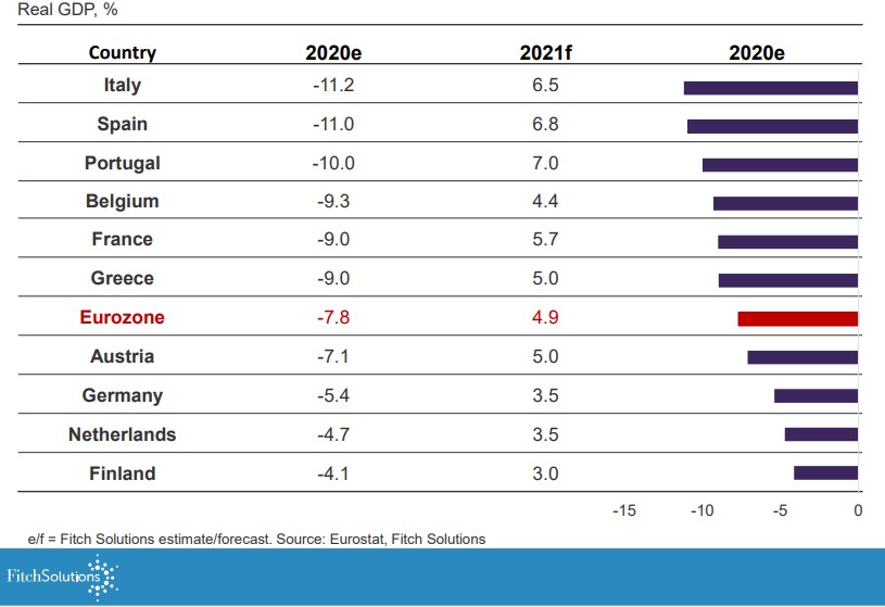 Σε ό,τι αφορά το σύνολο της ευρωζώνης, η Fitch Solutions διατηρεί σταθερές τις εκτιμήσεις της για την ύφεση του 2020 στο 7,8%, ενώ σημειώνει πως η ανάκαμψη θα ανεβάσει ρυθμούς όσο εκτυλίσσεται το 2021, όπου αναμένεται ότι η περιοχή θα σημειώσει ανάκαμψη 4,9%, υψηλότερη από τον μακροπρόθεσμο μέσο όρο. Ωστόσο, αυτή η ισχυρή ανάκαμψη θα είναι βραχυπρόθεσμη, όπως επισημαίνει, και εκτιμά πως το πραγματικό ΑΕΠ της περιοχής θα επιστρέψει σε χαμηλότερα επίπεδα από το 2023 κινούμενο με ρυθμούς της τάξης του 1,7% από εκείνο το έτος έως και το 2029.