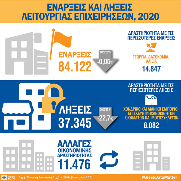 Στατιστικά στοιχεία για τη δημογραφία των επιχειρήσεων στην Ελλάδα κατά τα έτη 2019-2020 και ειδικότερα για τις ενάρξεις και τις λήξεις λειτουργίας των επιχειρήσεων ανακοίνωσε για πρώτη φορά η Ελληνική Στατιστική Αρχή (ΕΛΣΤΑΤ).