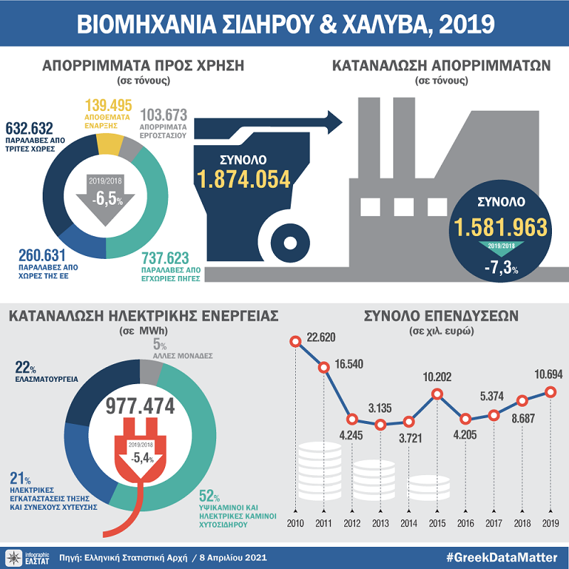 -Το σύνολο των απορριμμάτων προς χρήση στη βιομηχανία σιδήρου και χάλυβα για το έτος 2019, σε σύγκριση με το αντίστοιχο σύνολο του έτους 2018, παρουσίασε μείωση κατά 6,5%. Αύξηση κατά 5,1% είχε σημειωθεί κατά την αντίστοιχη σύγκριση του έτους 2018 με το 2017