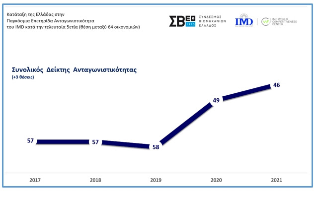 Ενισχύθηκε για δεύτερη συνεχόμενη χρονιά το 2021 η ανταγωνιστική θέση της Ελλάδας, με αποτέλεσμα να παρουσιάζει άνοδο τριών (3) θέσεων εν μέσω μάλιστα της πανδημίας COVID-19, σύμφωνα με τα στοιχεία του Institute for Management Development (IMD) της Ελβετίας.