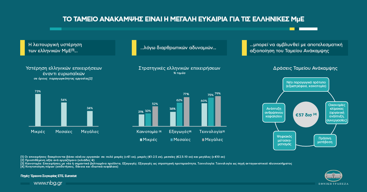 Συνοψίζοντας η ΕΤΕ αναφέρει πως η Ευρωπαϊκή Ένωση έκανε την υπέρβαση δημιουργώντας το Ταμείο Ανάκαμψης ως μια αποτελεσματική αντίδραση στην πανδημία. Σε αυτό το πλαίσιο, η Ελλάδα κατάφερε να κερδίσει σημαντικό μερίδιο των διαθέσιμων πόρων (από τα υψηλότερα μερίδια επιδοτήσεων σαν ποσοστό του ΑΕΠ), προσφέροντας παράλληλα ουσιαστική προτεραιότητα στις ΜμΕ (με στοχευμένες προς αυτές δράσεις της τάξης του €1,5 δις να είναι μεταξύ των πρώτων που προωθούνται). Η πρωτοβουλία πλέον περνάει σε μεγάλο βαθμό στις επιχειρήσεις να αξιοποιήσουν την ιστορική αυτή ευκαιρία, επιδεικνύοντας τα κατάλληλα αντανακλαστικά ώστε να τολμήσουν, να σχεδιάσουν και να υλοποιήσουν τα στρατηγικά σχέδια που θα τις καταστήσουν ανταγωνιστικές την επόμενη μέρα.