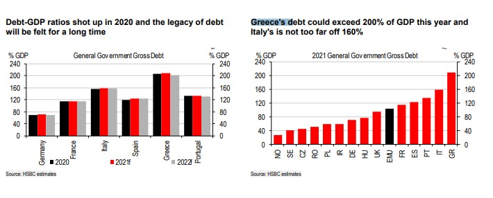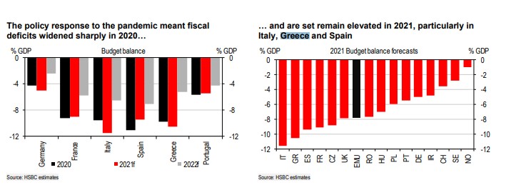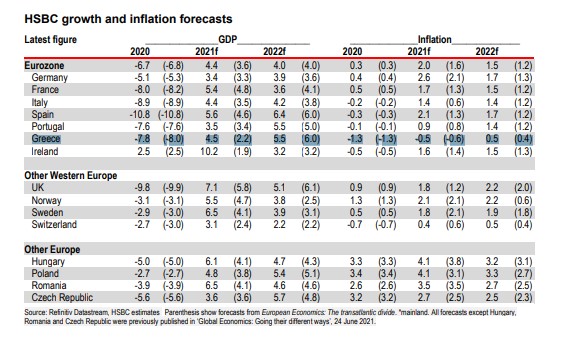 Σε ό,τι αφορά την Ελλάδα, η HSBC εκτιμά πως το ΑΕΠ θα επιστρέψει στα επίπεδα της κανονικότητας προ πανδημίας στο β’ τρίμηνο του 2022. Το ποσό της χαμένης παραγωγής της ελληνικής οικονομίας εκτιμάται στο δ’ τρίμηνο του 2022 να είναι επίσης χαμηλότερο σε σχέση με πριν και τοποθετείται στο 2,8% από 4%. Η ανάπτυξη της Ελλάδας στο δ ’τρίμηνο του 2022 τοποθετείται στο 3,7% από 3% που προβλεπόταν πριν.