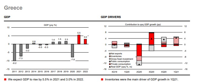 Η UniCredit συνεχίζει το μπαράζ των αναβαθμίσεων των εκτιμήσεων για την ανάπτυξη της ελληνικής οικονομίας φέτος που καταγράφεται το τελευταίο διάστημα από την πλειονότητα των διεθνών οίκων, τοποθετώντας πλέον το 2021 ως το έτος όπου ξεκίνα το μεγάλο growth story της Ελλάδας, αντίθετα με πριν που γενικότερα θεωρούνταν πως το 2022 θα είναι αυτό που θα σημειωθεί η μεγάλη εκτόξευση.
