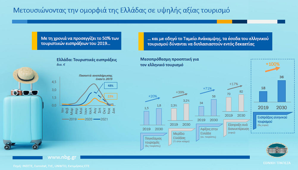 Στη μελέτη που πραγματοποίησε η Διεύθυνση Οικονομικής Ανάλυσης της Εθνικής Τράπεζας (i) αξιολογούνται τα πρώτα σημάδια για τη φετινή τουριστική χρονιά και (ii) εκτιμώνται οι μεσοπρόθεσμες δυνατότητες ανάπτυξης που προσφέρουν τόσο η διαφαινόμενη επιστροφή στην ομαλότητα όσο και η προοπτική των πόρων που διατίθενται μέσω του Ταμείου Ανάκαμψης.