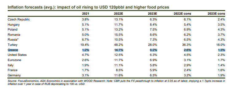 Σύμφωνα με το βασικό πλέον σενάριο της Wood, μετά και το ξέσπασμα του πολέμου στην Ουκρανία, το ΑΕΠ όλων των χωρών της περιοχής της Ευρώπης και της Μέσης Ανατολής που καλύπτει (ΕΜΕ), θα μειωθεί κατά 2% σε σχέση με τις προηγούμενες προβλέψεις, ενώ σε ένα σενάριο εκτίναξης του πετρελαίου στα 120 δολ. το βαρέλι και ανόδου των τιμών των τροφίμων, υπάρχει μεγάλη πιθανότητα ο πληθωρισμός φέτος να εκτοξευθεί σε διψήφια ποσοστά.