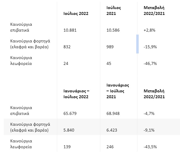 Συνολικά, στο διάστημα Ιανουάριος-Ιούλιος, για το οποίο υπάρχουν τελικά στοιχεία, ταξινομήθηκαν σχεδόν 66.000 οχήματα, ήτοι μείωση 4,7% σε σχέση με το αντίστοιχο διάστημα του 2021.