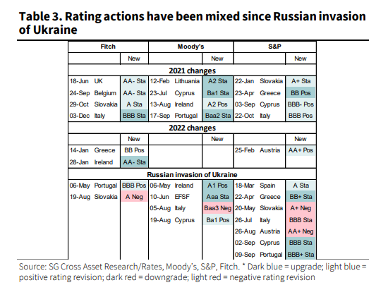 Όπως σημειώνει η Société Générale, η τάση στις αξιολογήσεις των χωρών της ευρωζώνης από τους οίκους ήταν μικτή μετά τη ρωσική εισβολή στην Ουκρανία: οι αξιολογήσεις για την Πορτογαλία, την Ελλάδα και την Ιρλανδία έχουν αναβαθμιστεί, ενώ οι θετικές τάσεις στις αξιολογήσεις για την Ιταλία και την Αυστρία έχουν σταματήσει.
