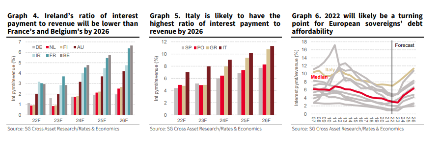 Οι οικονομολόγοι της SocGen βλέπουν τώρα αυτός ο δείκτης να αυξάνεται για όλες τις ευρωπαϊκές χώρες, αλλά η αύξηση θα είναι περιορισμένη για την Ιρλανδία. Η αναλογία πληρωμών τόκων προς έσοδα της Ιταλίας θα συνεχίσει να είναι η υψηλότερη μέχρι το 2026, ενώ η Ελλάδα – όπως φαίνεται και στο παρακάτω γράφημα - θα την πλησιάσει.