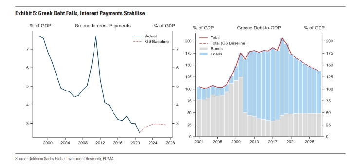 Η Goldman αναμένει ότι το σχετικά ισχυρότερο μακροοικονομικό υπόβαθρο και η μακρά διάρκεια της ευρωπαϊκής οικονομικής βοήθειας θα περιορίσουν τον αντίκτυπο της αύξησης των επιτοκίων στις πληρωμές τόκων της Ελλάδας κάτω από το 3% του ΑΕΠ και θα στηρίξουν τη φθίνουσα πορεία του χρέους προς το ΑΕΠ που εκτιμάται ότι θα φτάσει στο 150% του ΑΕΠ έως το 2025.