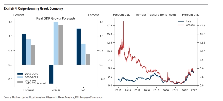Όπως σημειώνει η αμερικανική τράπεζα, η Ελλάδα αναμένεται να συνεχίσει να έχει καλύτερη απόδοση από την ευρωζώνη το 2023, με την Ε.Ε. και το ΔΝΤ να προβλέπουν μέση αύξηση του πραγματικού ΑΕΠ στο 1,3% σε σύγκριση με την πρόβλεψη της Goldman Sachs για -0,1% ύφεση στην ευρωζώνη το επόμενο έτος.