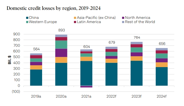 Σε περιφερειακό επίπεδο, κατά την τριετία έως το τέλος του 2024, ο οίκος εκτιμά ότι οι πιστωτικές ζημιές θα κυμανθούν από το περίπου 9%-19% της κερδοφορίας στη Βόρεια Αμερική και τη Δυτική Ευρώπη έως περίπου το 35% της κερδοφορίας στη Λατινική Αμερική.