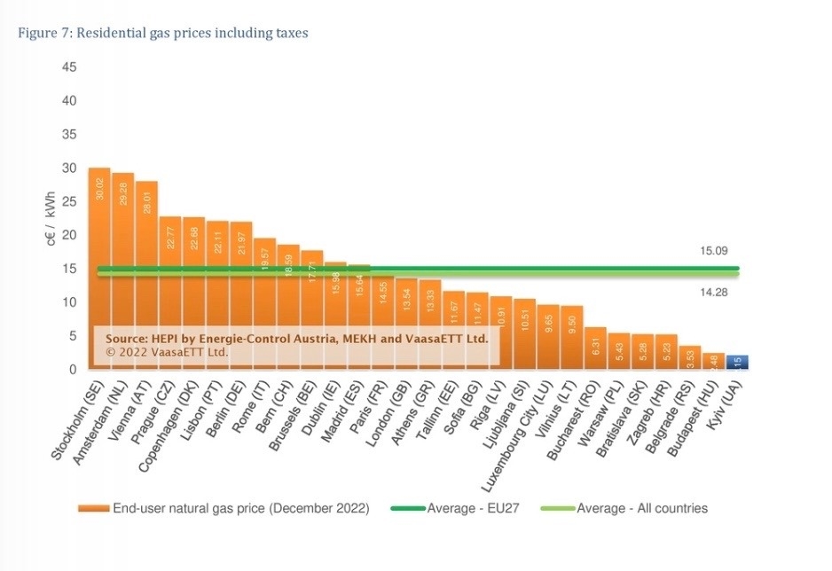 Σε ότι αφορά το φυσικό αέριο για τους οικιακούς καταναλωτές, η Ελλάδα κατατάσσεται στην 14η φθηνότερη θέση, σε σύνολο 28 χωρών, καθώς η τιμή στη χώρα μας για τον Δεκέμβριο του 2022 διαμορφώθηκε στα 13,33 λεπτά/KWh, χαμηλότερα από τη μέση τιμή της Ε.Ε., η οποία είναι στα 15,09 λεπτά/KWh.